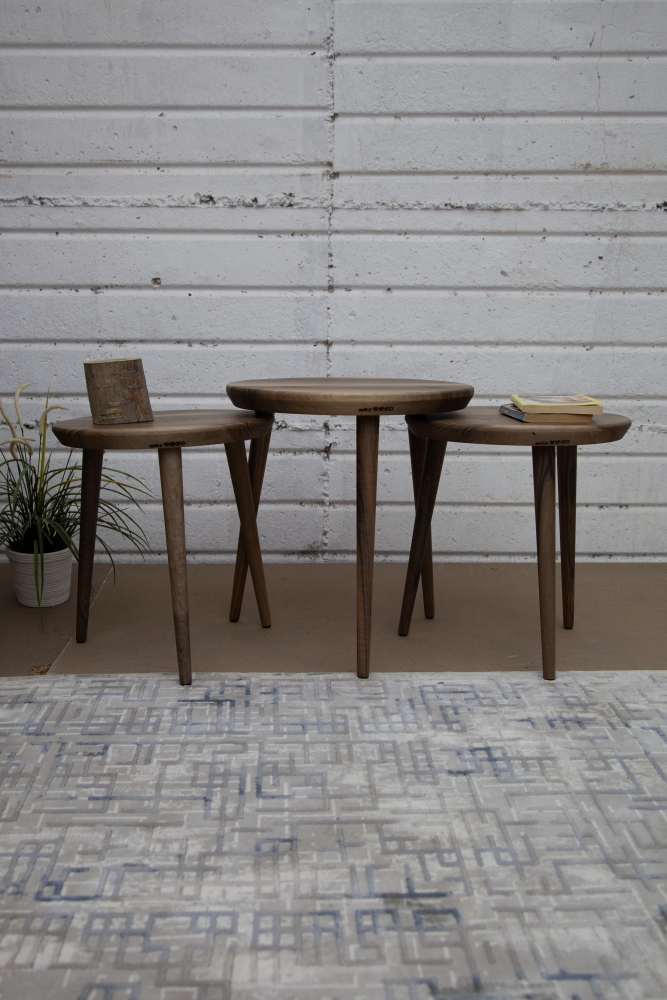 Bu el yapımı yuvarlak sehpa takımı, sade şıklığı ve doğal dokusuyla öne çıkar. Mat pürüzsüz yüzeyi yansımaları engellerken, ahşabın sıcaklığını doğrudan hissettirir.